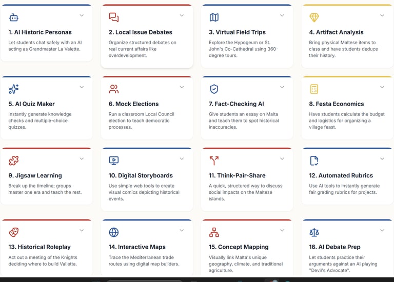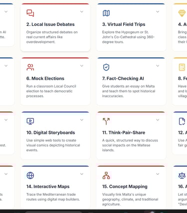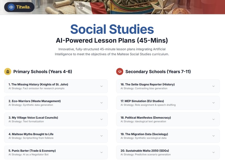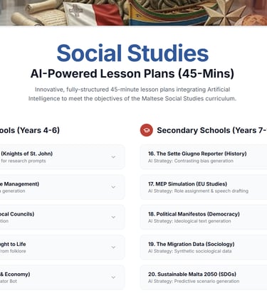 A Social Studies educator hub designed to help Maltese teachers integrate AI into their social studies lessons for primary and secondary students. It provides fully-structured, 45-minute AI-powered lesson plans, teaching strategies, and curated resources.