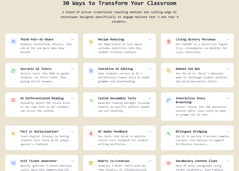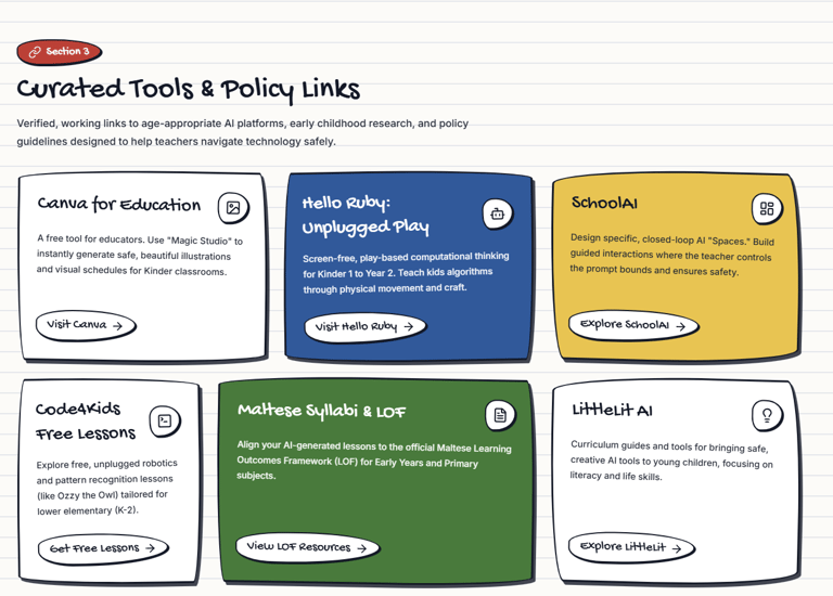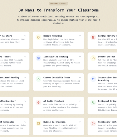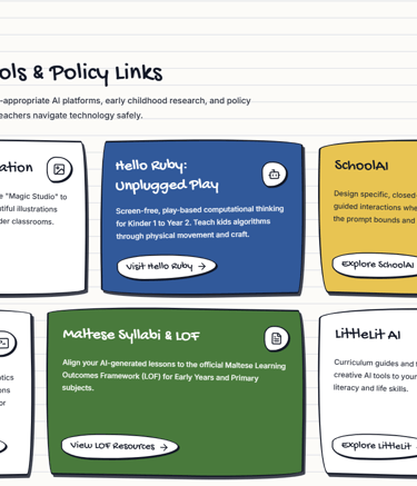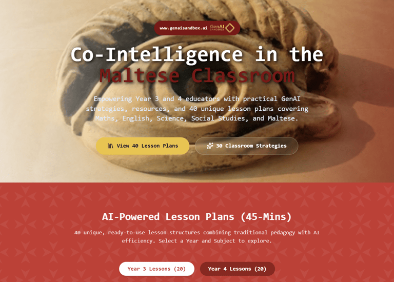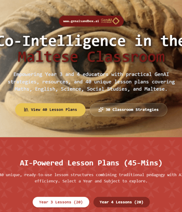A localised digital hub designed to empower Maltese Year 3 and 4 educators by practically integrating Generative AI into their daily teaching. It provides 40 ready-to-use, AI-powered lesson plans and a curated directory of educational tools to help reduce teacher workload and boost student engagement.